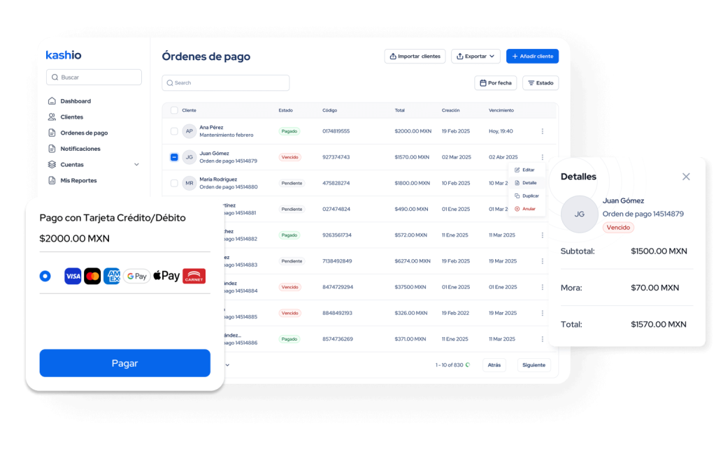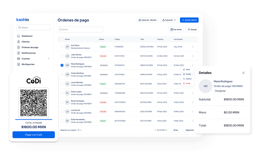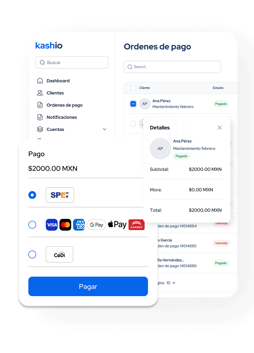 us clientes pueden elegir pagar desde el canal de su preferencia. Con Kashio, aceptas pagos con tarjetas, SPEI, CoDi, Cash y más, conciliando todo en una sola plataforma.